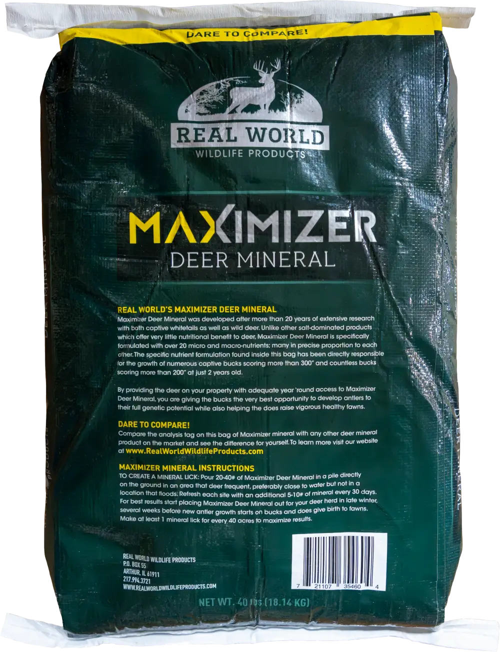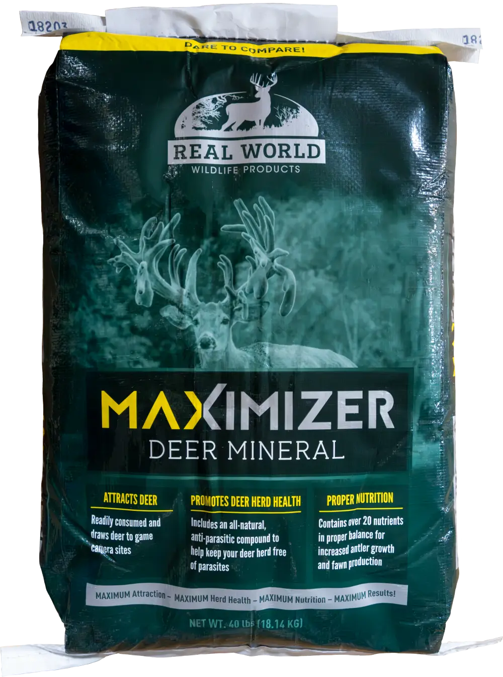 Most deer mineral products on the market WILL attract deer. The difference with Real World Maximizer Mineral is that it can also support your deer herd’s health, antler growth and fawn production while also drawing them in for your trail camera. Why settle for JUST an attractant when you can support antler growth, fawn production and herd health at the same time?